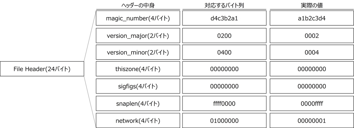 1については、pcapファイルは、「File Header(24バイト)+Packet Header(16バイト)+Packet Data(可変長)+以降、Packet Header(16バイト)+Packet Dataがパケット分繰り返される」という構造になっていることを説明しました。また、File Header、Packet Headerについてはさらに複数の要素に分解できることを説明しました。